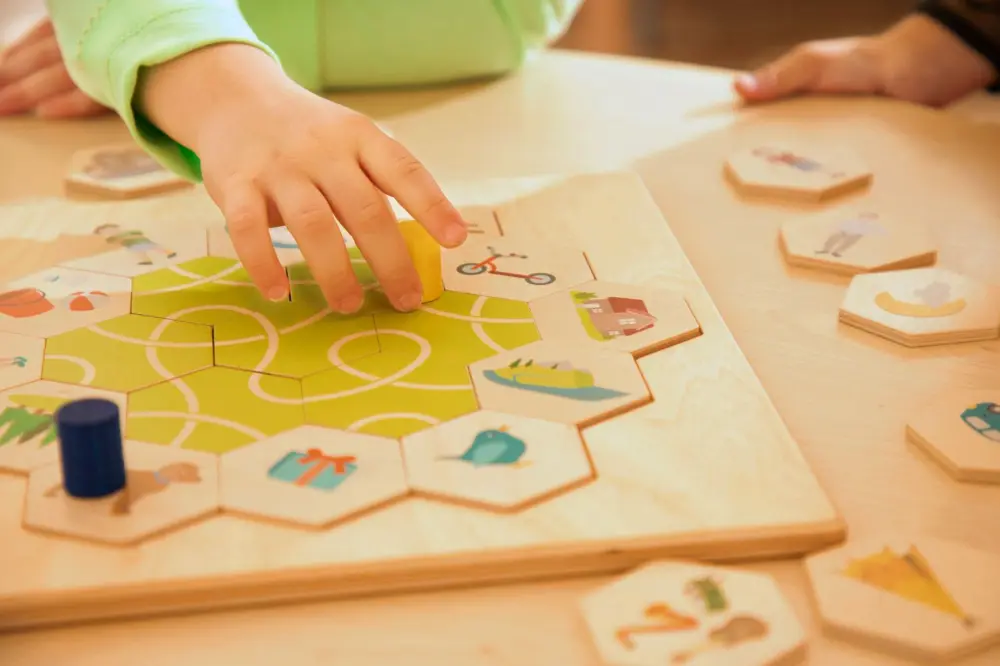 Durch die Wege im Inneren des Spielbretts lässt sich bestimmen, welches Bild mit welchem anderen verbunden wird. Für jüngere Kinder ist das ein einfacher Einstieg.